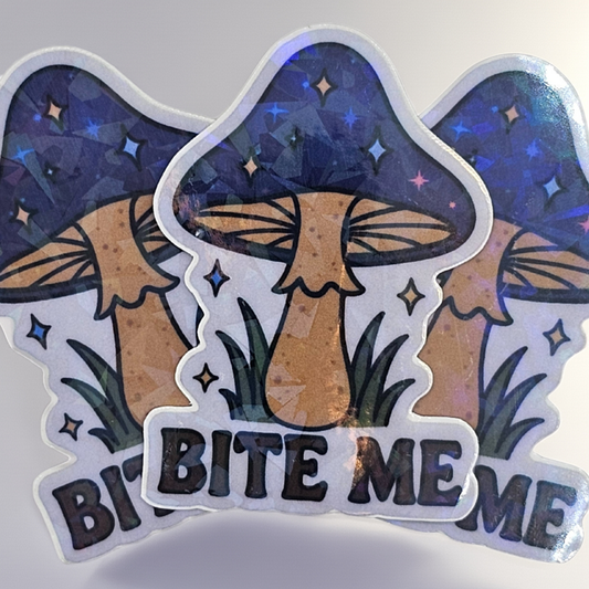Bite Me Mushroom Sticker – Holographic Cottage core Sass with Sparkle