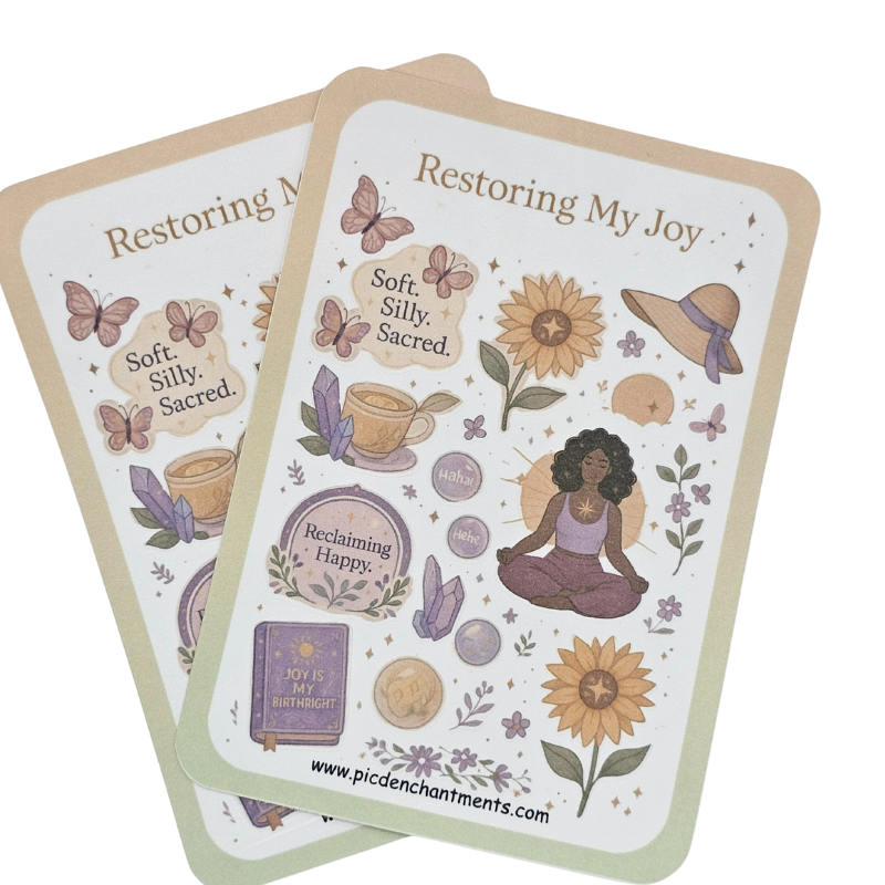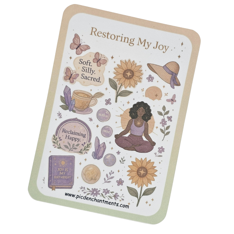 Embrace your healing era with the Restoring My Joy sticker sheet – a gentle celebration of softness, silliness, and sacred self-care. Each hand-drawn design radiates warm, playful energy, featuring sunflowers, butterflies, crystals, and a serene goddess figure. Affirmations like “Soft. Silly. Sacred.” and “Reclaiming Happy.” remind you that joy isn’t just a feeling – it’s your birthright.